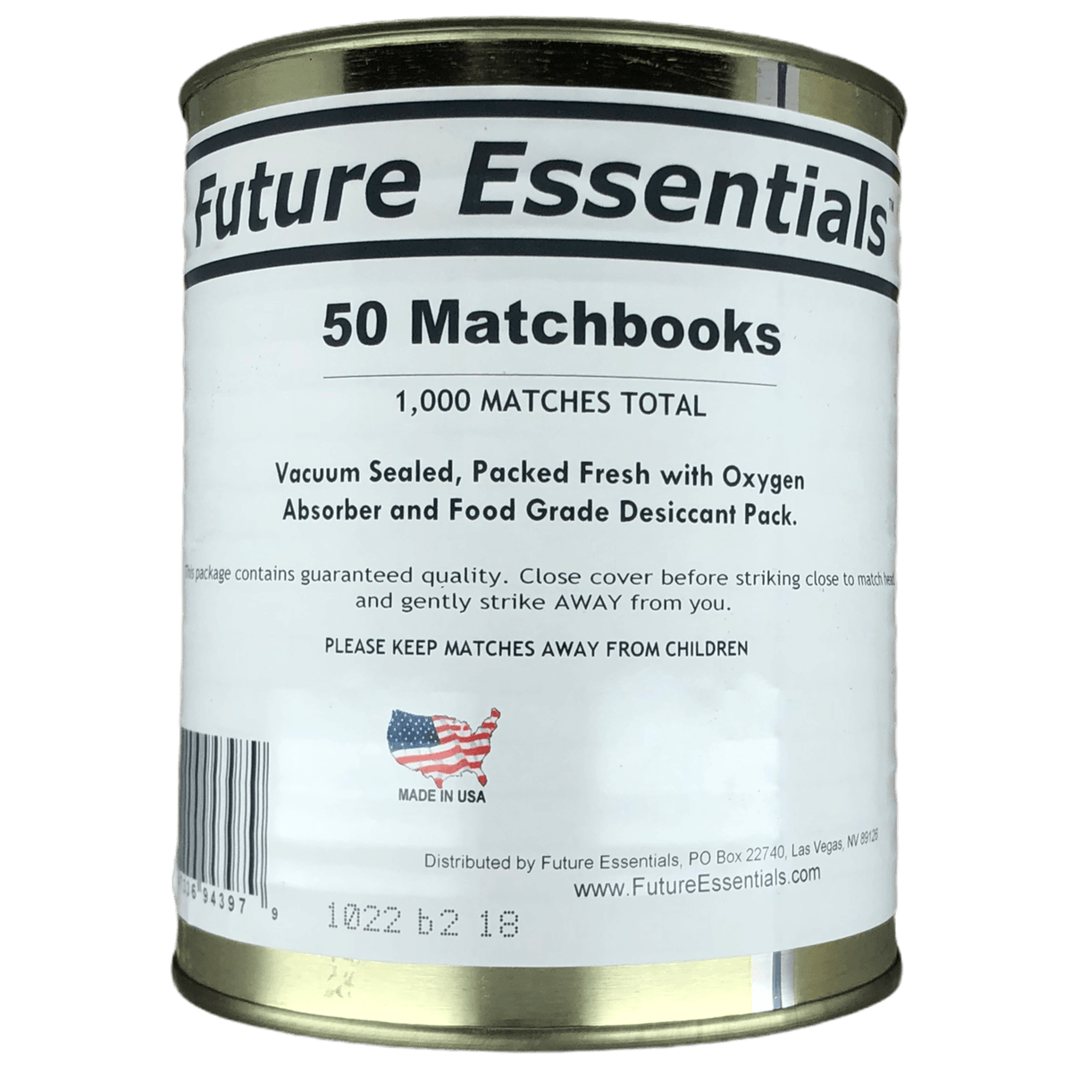 The Future Essentials Canned Matchbooks Disaster Kit contains #2.5 cans of waterproof matches. Each can contain 50 matchbooks, each with 20 matches, for  1000 matches. The canned matchbooks are stored in a waterproof container, so you can be sure they will be dry and ready to use, even in an emergency.