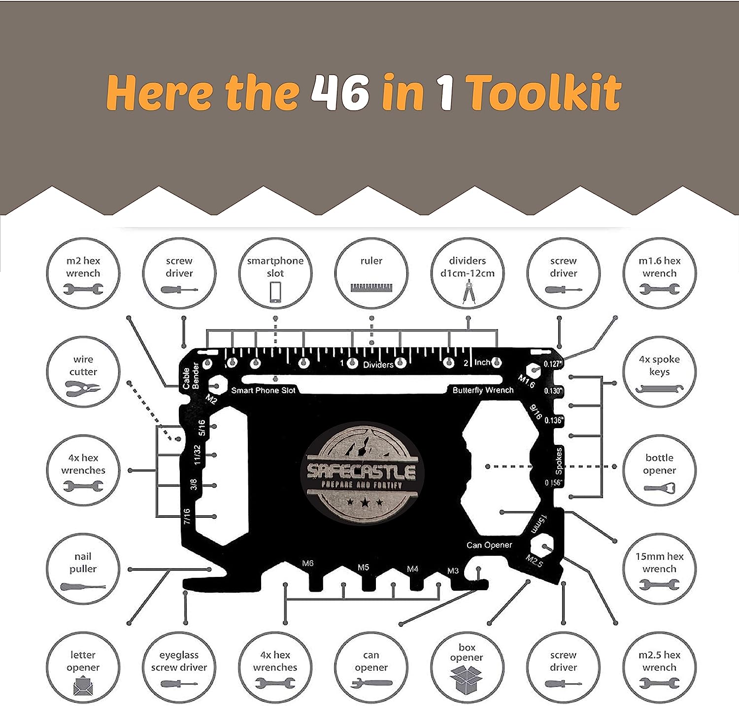 The pack contains the FNIRSI Radiation Dosimeter, which includes the geiger counter and its associated features, along with the Safecastle ToolKit Multitool kit, providing you with additional tools for your safety and convenience.