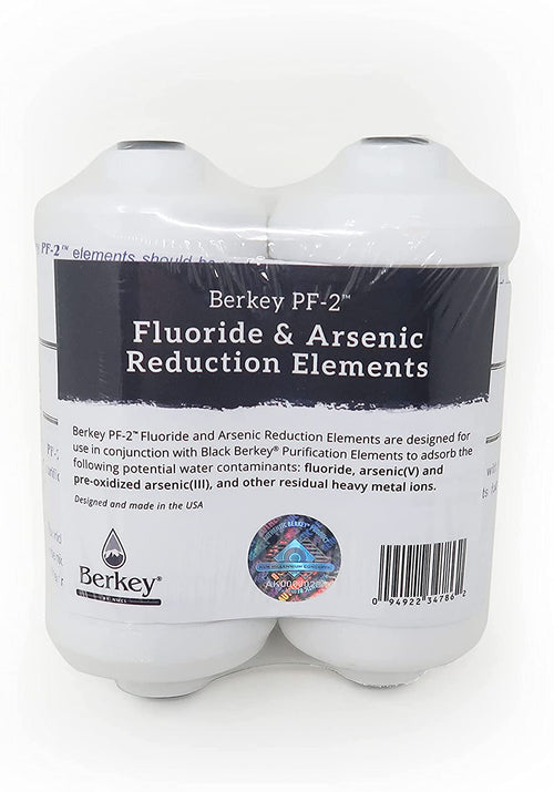Berkey PF-2 fluoride and arsenic reduction elements are designed for use in conjunction with black berkey elements to adsorb fluoride, arsenic(v) and pre-oxidized arsenic(iii), and other residual typical heavy metal ions.