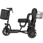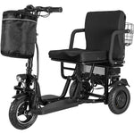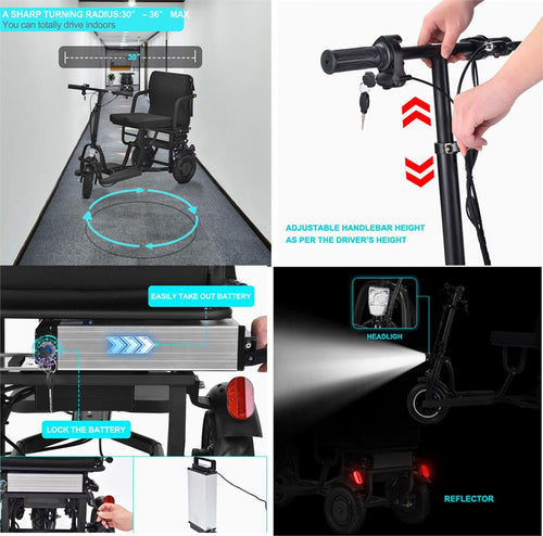 The lightweight and durable frame of the motor tricycle is made from aluminium, ensuring both strength and mobility. The trike is equipped with a comfortable seat and backrest, providing a pleasant riding experience. Further, it features front and rear baskets, allowing for convenient storage of personal belongings.