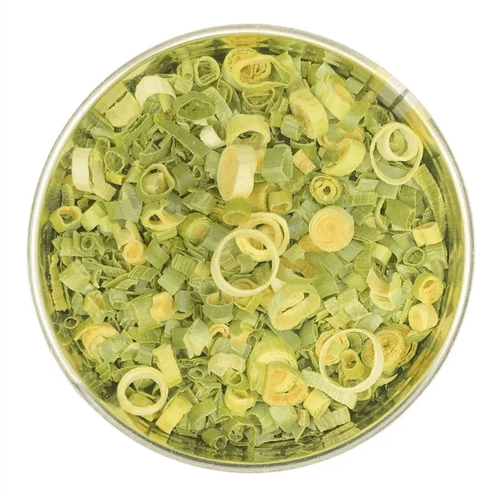 Future essentials remove moisture from fresh green onions using extremely low temperatures and a vacuum. About 3% of the moisture is left in the green onion that has been frozen when it is packaged. The final product's weight is reduced by nearly 90%, but the volume remains unchanged.