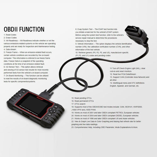• ADVANTAGES Diagnose Single Brand of most Models (OBDII-16DLC) Full System Diagnosis Support Oil Service Reset Electronic Parking Brake (EPB) system maintenance Diesel Particulate Filter (DPF) Regeneration Control System Electronic Throttle Control System (ETC) Steering Angle Sensor (SAS) Calibration Read&Clear DTC Read Live Data Support Data Review and Print Full Speed Upgrade Via PC 4.0″ TFT LCD, 480*320 Pixels Support Multi-Language