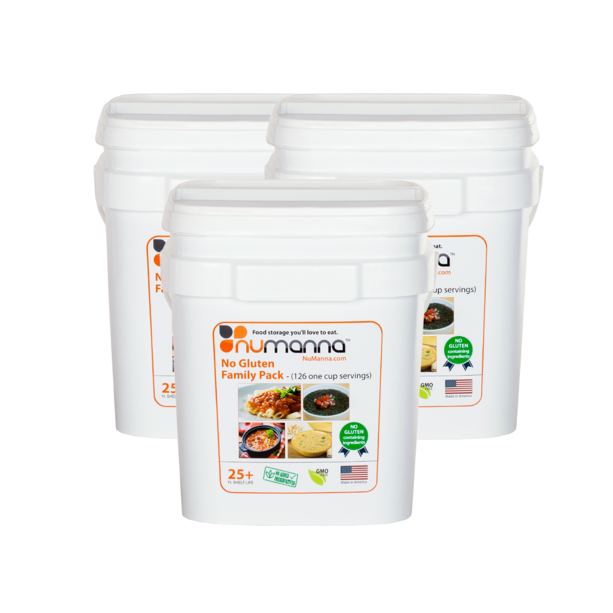 The Numanna Triple No-Gluten Family Pack offers the same high-quality, chemical-free recipes as our legendary family packs, but without any wheat gluten. Perfect for those with gluten sensitivities, this package includes three EZ Stack Buckets filled with a diverse selection of gluten-free meals. Enjoy nutritious and delicious food that meets your dietary needs now or in the future.