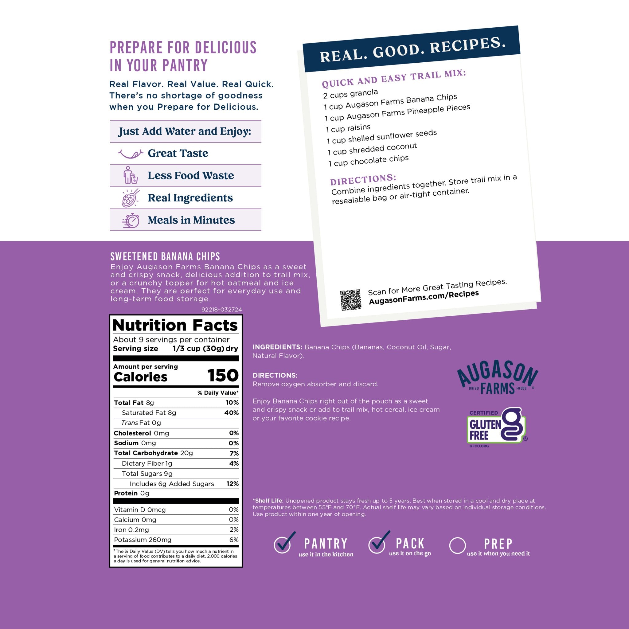 Enjoy Augason Farms Banana Chips as a sweet and crispy snack, delicious addition to trail mix, or a crunchy topper for hot oatmeal and ice cream. They are perfect for everyday use and long-term food storage