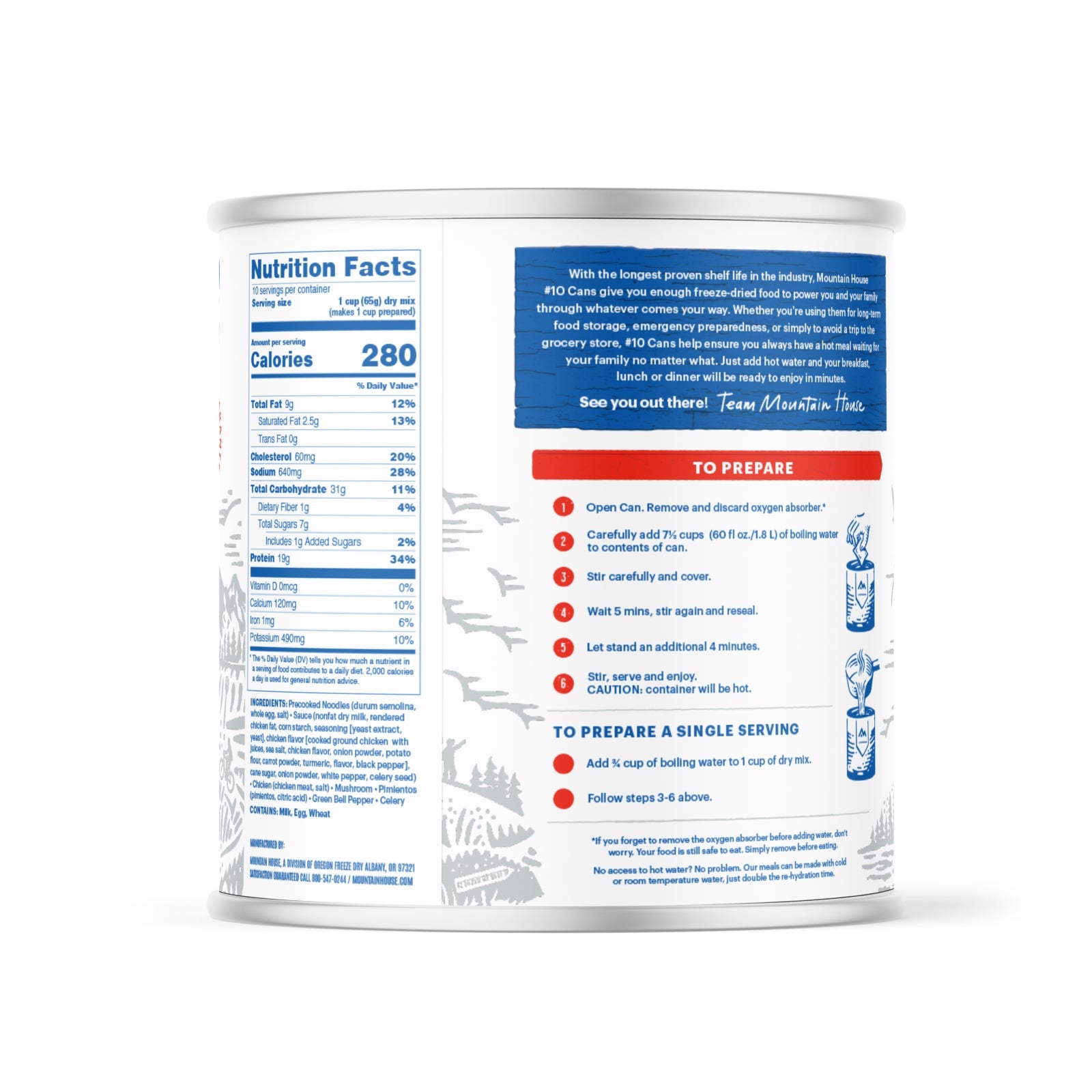 Treat yourself or your loved ones to a comforting, hearty meal with Mountain House Homestyle Chicken Noodle Casserole. Made with real chicken, tender noodles, and wholesome vegetables like mushrooms, celery, and green peppers, this casserole is perfect for quick dinners or emergency preparedness. The creamy, flavorful sauce ties everything together, offering the rich, homestyle taste of a classic chicken noodle casserole.