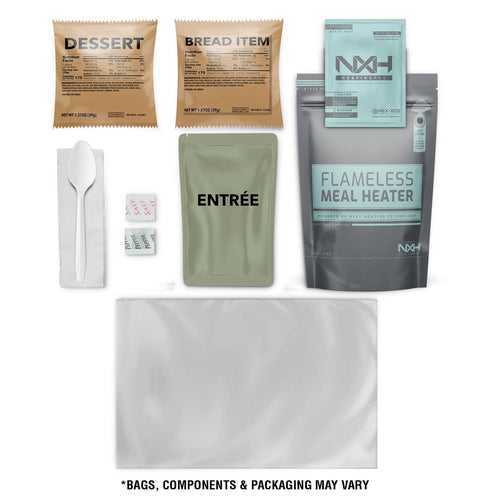 Our meal rations come with an accessory kit that includes utensils, napkins, and a non-toxic, flameless ration heater. The XMRE meals are packed with NXH technology, a proprietary blend of non-toxic chemicals that keeps the food fresh and tasty.