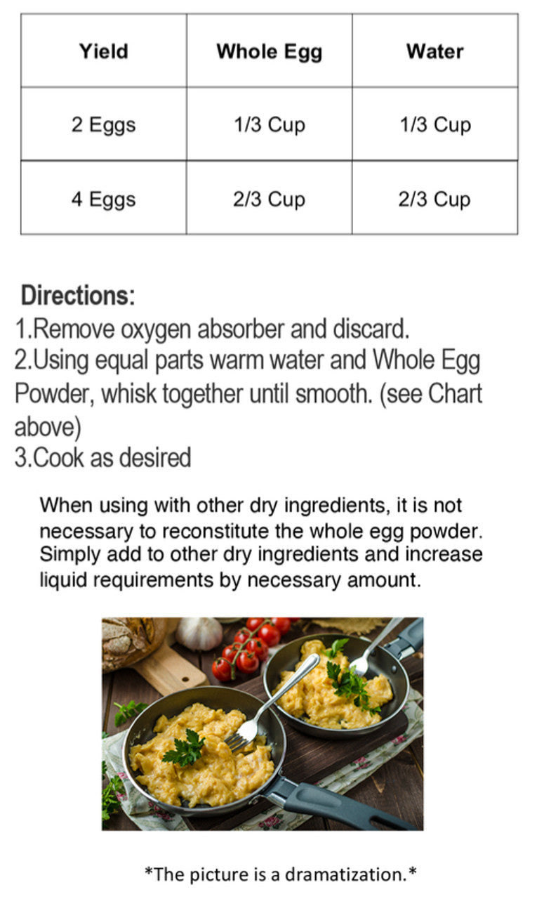 • Scrambled Eggs: Rehydrate and cook as you would with fresh eggs for a quick and nutritious meal.