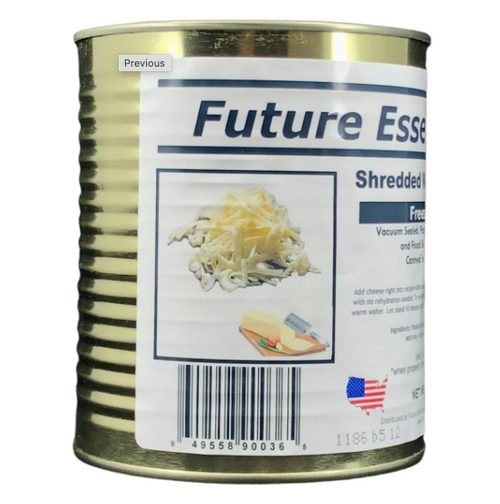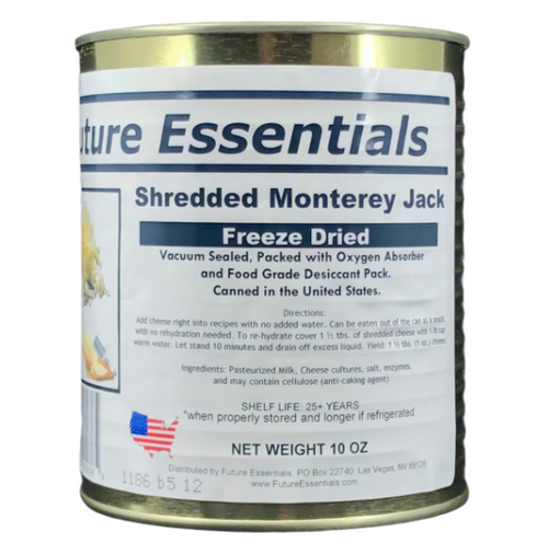 Future Essentials Freeze Dried Monterey Jack cheese melts instantly once it is rehydrated and can be used in various recipes, including casseroles, pizzas, soups, chilis, and salads. It is made from American dairy products, canned, and prepared in the States.