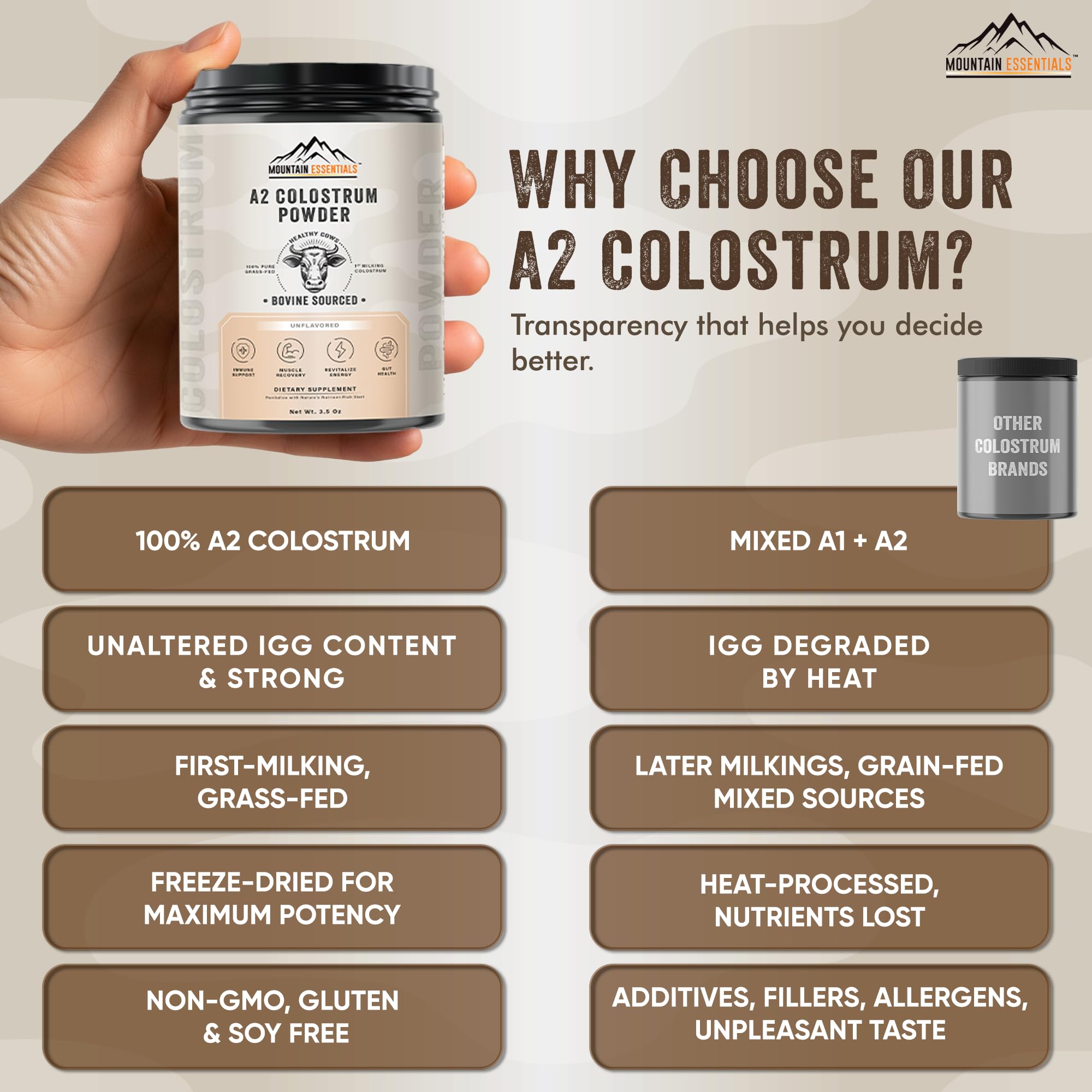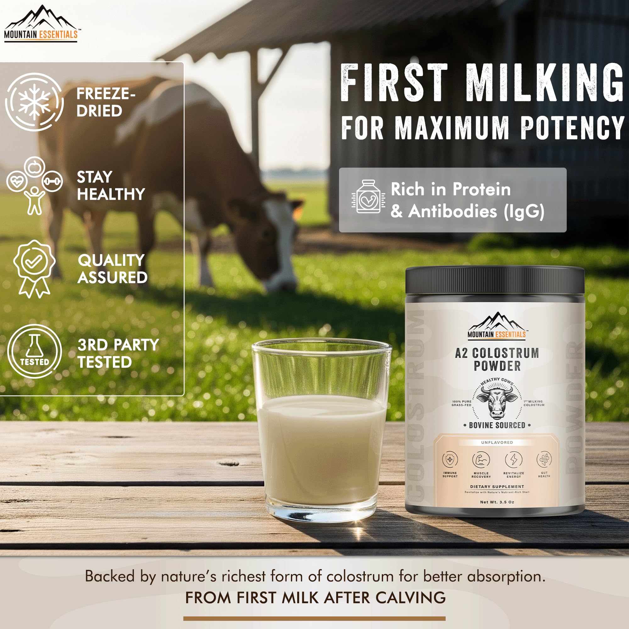<p>Discover the pure benefits of MOUNTAIN ESSENTIALS A2 Colostrum Powder &ndash; a premium choice sourced from grass-fed bovine. This unflavored first-milking colostrum powder is carefully processed to maintain its natural integrity, making it a versatile addition to your daily routine.</p>