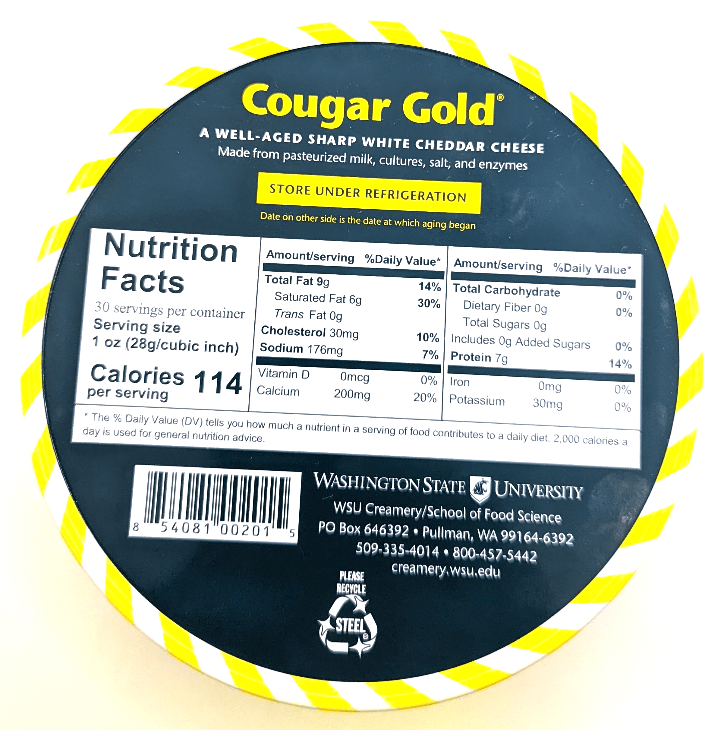 WSU cougar gold cheddar - Our most famous and popular cheese has won several national and international awards. It's a rich, white cheddar with a smooth, firm texture that comes in our famous 30 oz can. Upon arrival, we recommend refrigerating it immediately.