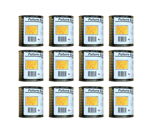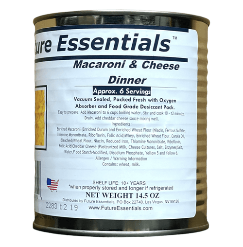 Future Essentials offers canned macaroni and cheese, which are ideal for emergency and long-term food storage. Available in #2.5 cans, each containing approximately 14-16 ounces, this ready-to-eat mac and Cheese provides six servings, equivalent to 2 boxes of traditional mac & Cheese.