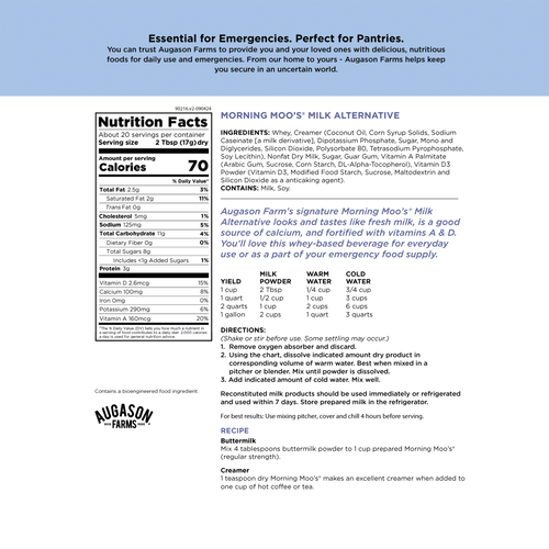 Augason Farm's signature Morning Moo’s® Milk Alternative looks and tastes like fresh milk, is rich in calcium, and fortified with vitamins. You’ll love this whey-based beverage for everyday use or as a part of your emergency food supply.