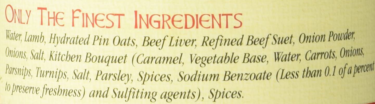 Water, Lamb, Hydrated Pin Oats, Beef Liver; Refined Beef Suet, Onion Powder.