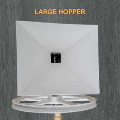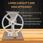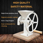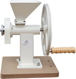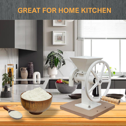 The advantage of this mill is easy cleaning of the grind plates and no stone particles in the flour. Also, the mill is nicely heavy and easy to operate, and can be belt driven with a slow-enough electric motor. Step-down gearing could also be used, if necessary.