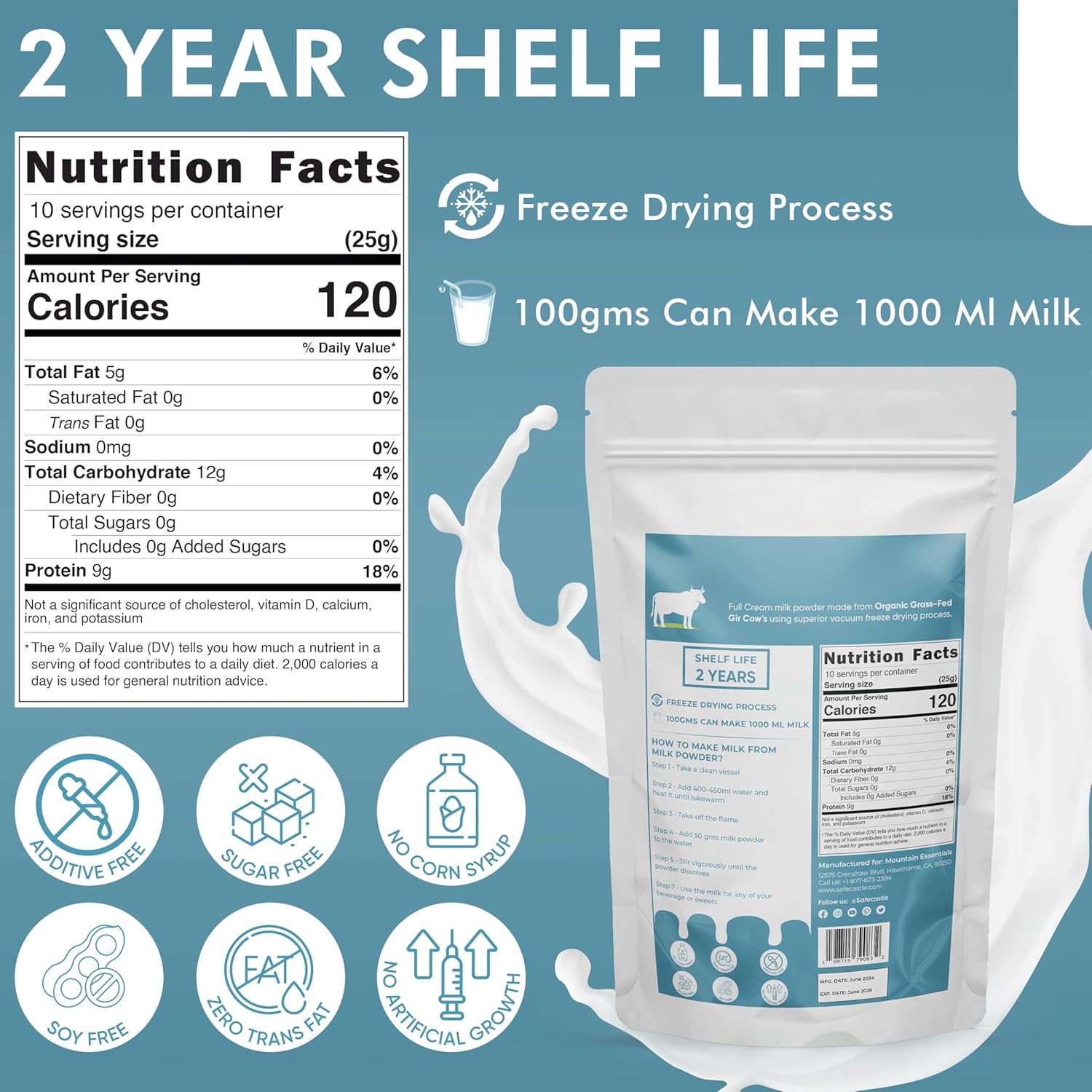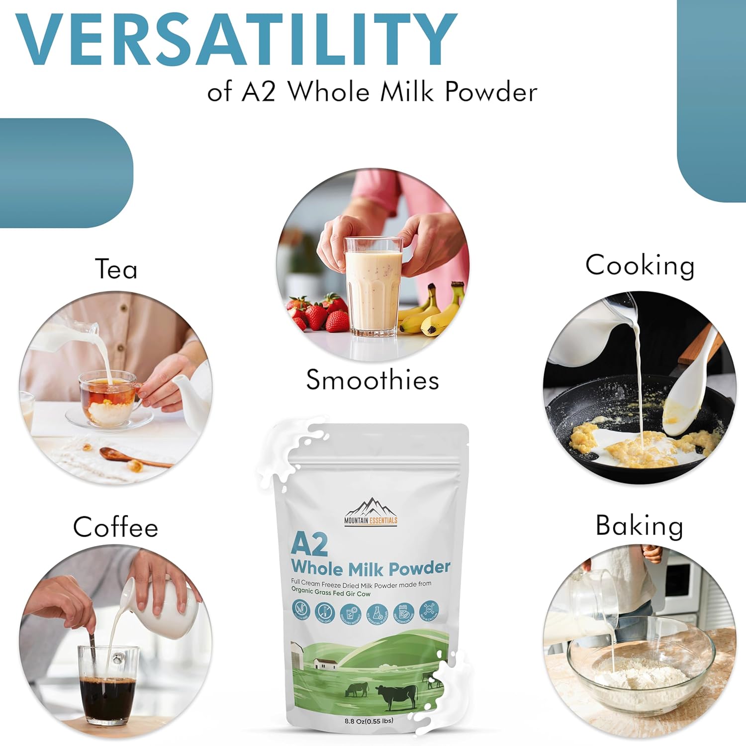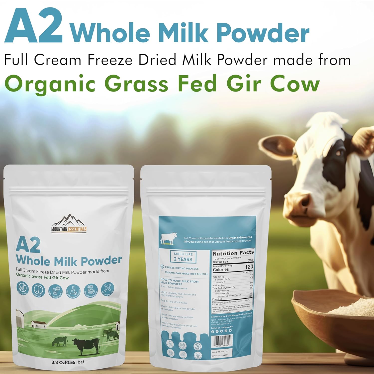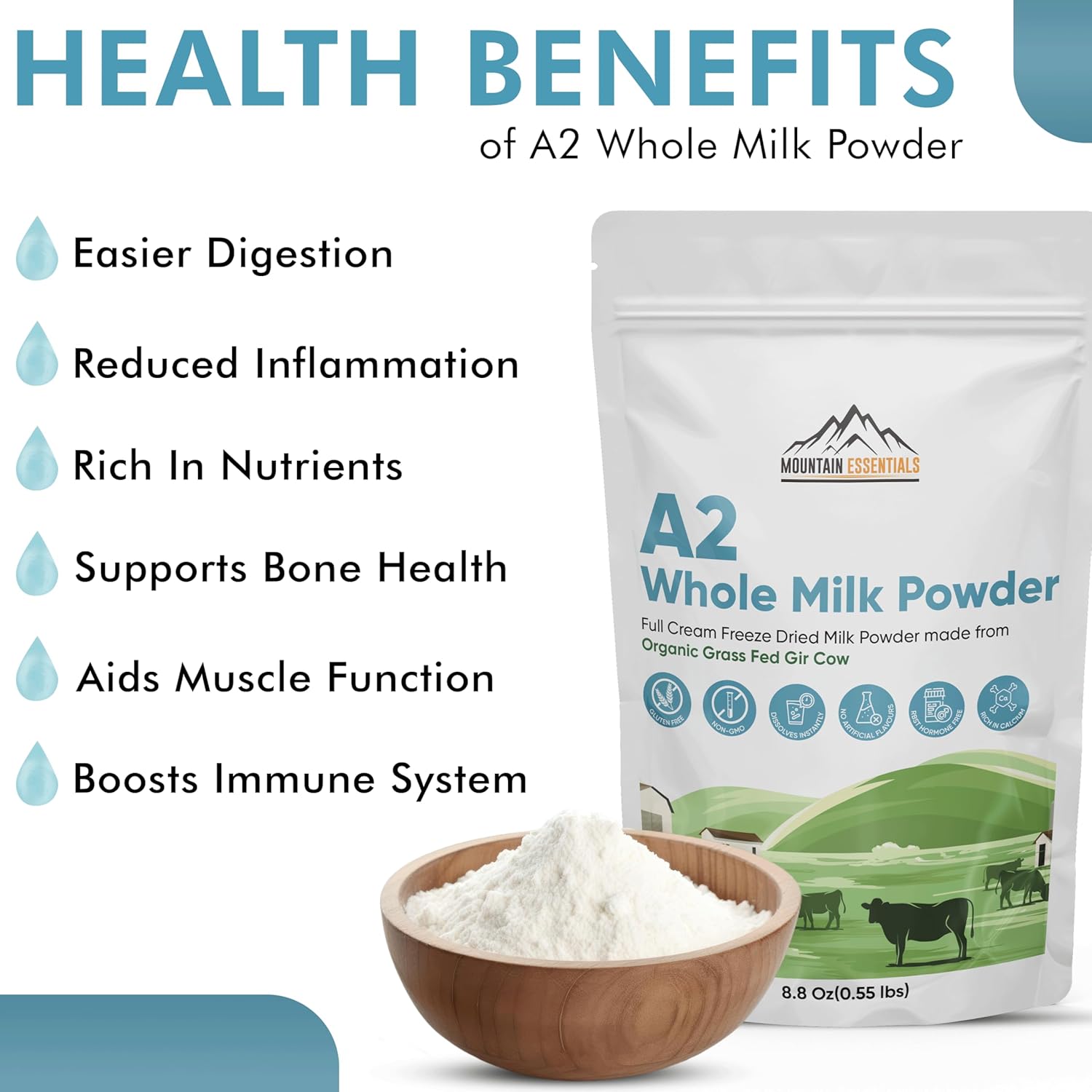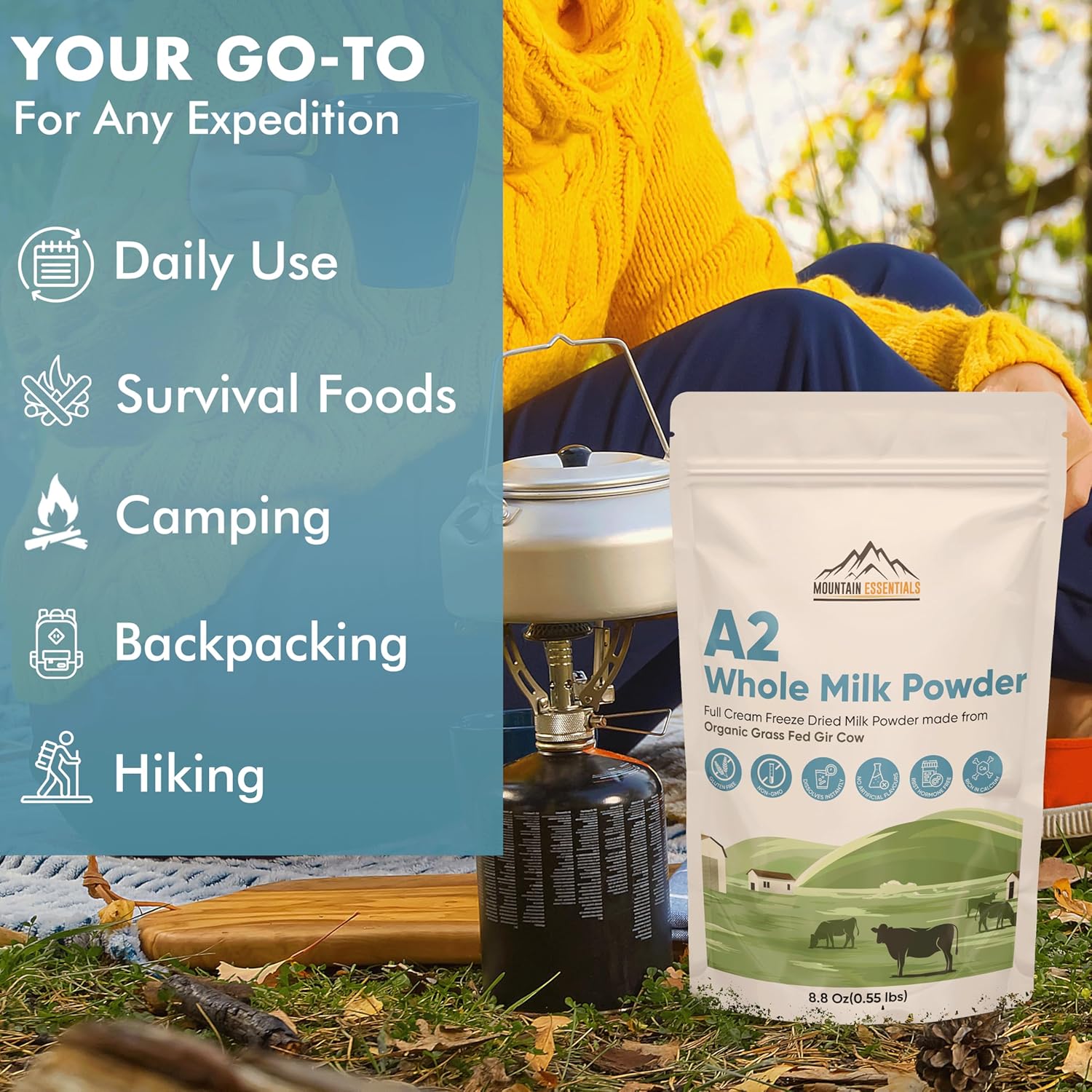 Mountain Essentials A2 Whole Milk Powder 8.8 Oz Gluten Free Full Cream Freeze Dried Shelf Stable Non- GMO Powdered Milk Made from Organic Grass Fed Gir Cow Easy to Digest, Perfect For Cooking & Baking