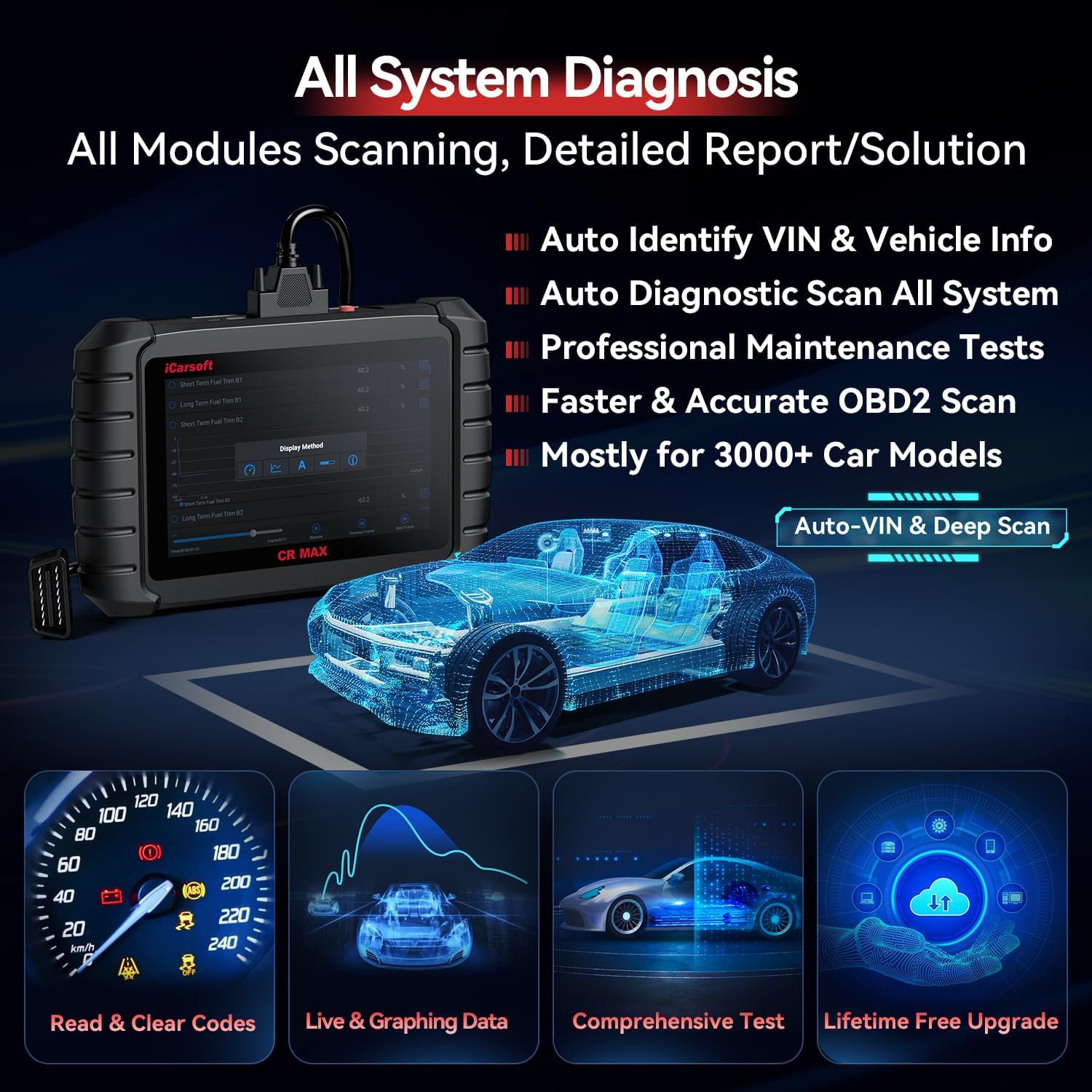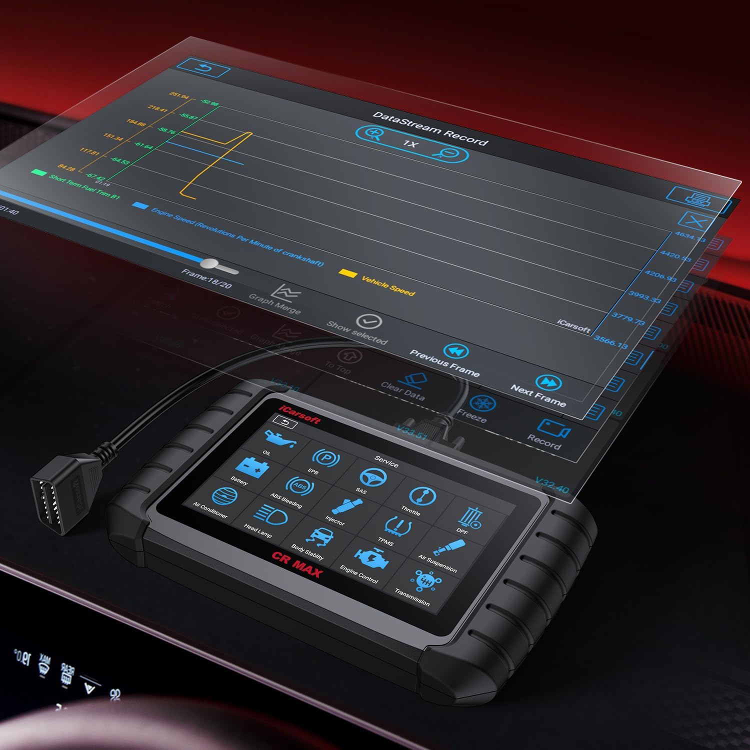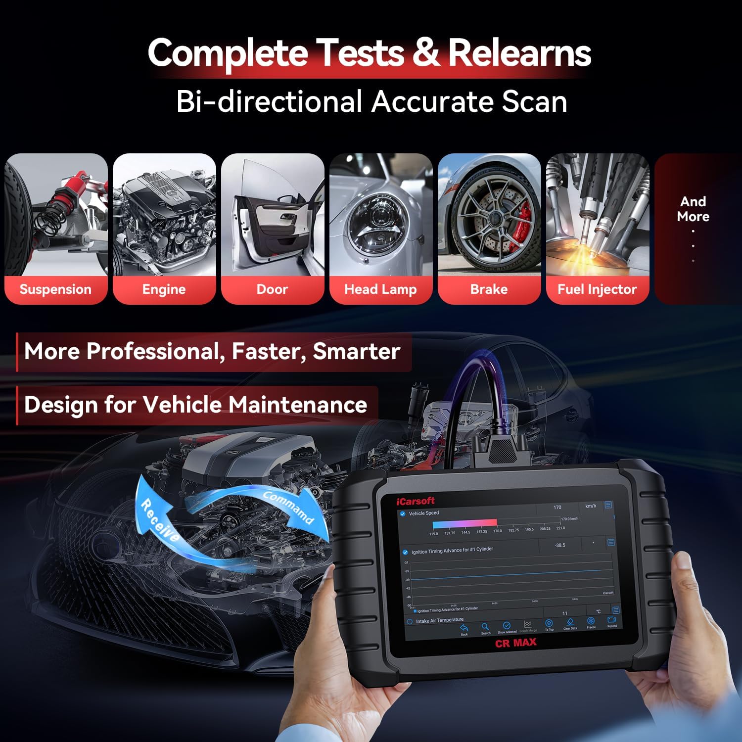 • ACTUATION TEST / BI-DIRECTORY CONTROLS DIAGNOSTIC- iCarsoft CR Max (2024 new) car diagnostic obd2 scanner integrates all functions, provides OE-level services for bidirectional diagnosis all system & read codes,Auto VIN scan, Identify car information, Quick Test, module reset/relearn, Control Unit, Service and Quick Erase, live data stream, built-in DTC library, data play back and print, generate a vehicle health report.