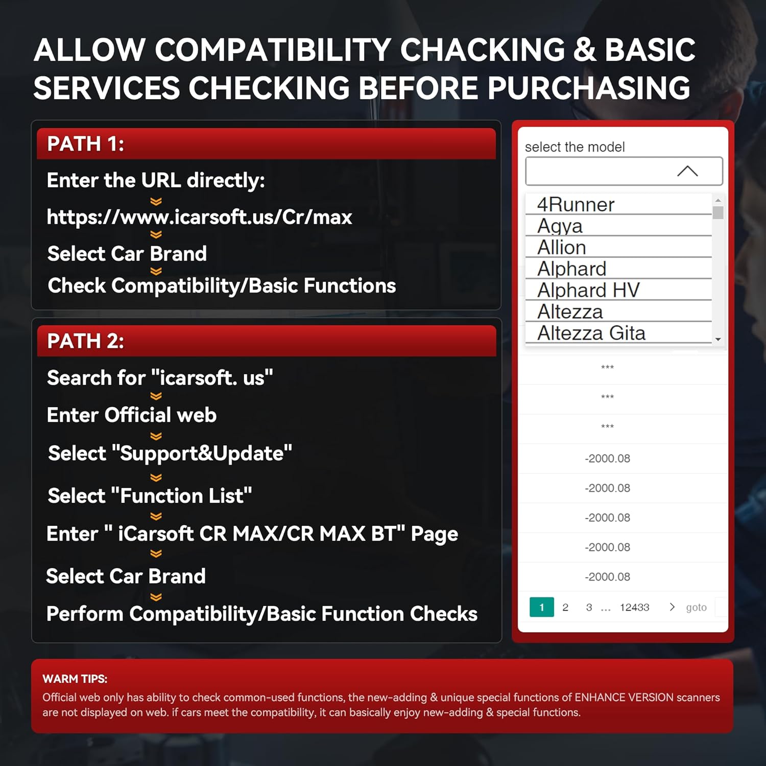 • Note 1: All Scanners are primarily used for diagnostics, data retrieval, and adjustments, and won't cause vehicle to not start or other problem about starting. However, if you ever experience any concerns with your vehicle's starting condition after using the iCarsoft CR Max (Enhance Version) , you can contact us. Note 2: As Car manufaturers upgrades their Vehicle system irregularly, which will lead some compatibility trouble or some functions do not work well, BUT JUST UPDATE THE SCANNER THEN THE TROUBLE CAN BE SOLVED! OR CONTACT US TO FIX IT.