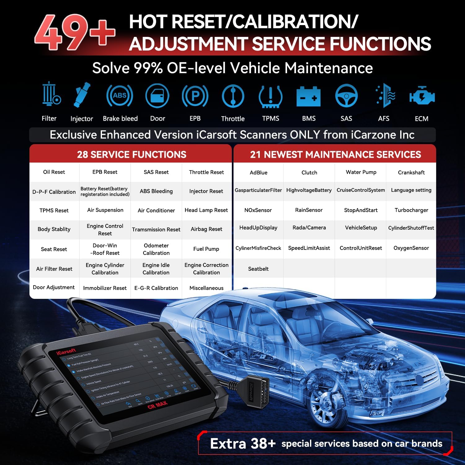 • 49 RESET +38 SERVICES- It performs:Oil Reset, EPB,SAS,Throttle, D-P-F, Battery, ABS,Injector, TPMS, Air Suspension, Air Conditioner, Head Lamp, Body Stablity, Engine, Tramsmission, Airbag,Seat, Door-Win-Roof, Odometer, Fuel Pump, Air Filter, Engine Cylinder,Idle, Engine Correction, Door, Immobilizer, E-G-R.+21 NEWEST SERVICES( Need update scanner)-AdBlue, Clutch, WaterPump, Crankshaft, GasparticulaterFilter, HighvoltageBattery, CruiseControl, Languagesetting, NOxSensor, RainSensor, StopAndStart, Turbocharger, HeadUpDisplay, Rada/Camera, VehicleSetup, CylinderShutoffTest,CylinerMisfireCheck, SpeedLimitAssist, ControlUnitReset, OxygenSensor, Seatbelt.Extra 38+ extra services based on car brand