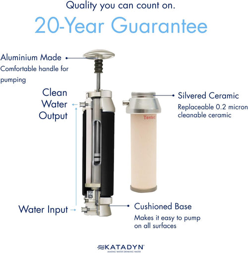 Built to endure extreme conditions, the Katadyn Pocket features a 0.2-micron silver-impregnated ceramic filter that meets EPA standards for bacteria and protozoan cyst removal. Enjoy peace of mind with a lifetime warranty against materials and workmanship.