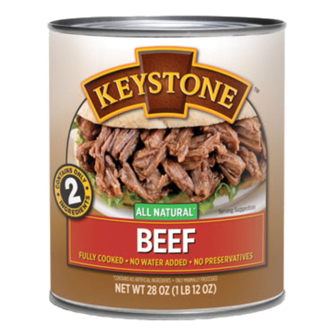 Keystone All Natural Beef: Hand-packed, fully cooked beef that's perfect for quick and delicious meals like stews, stir-fries, and BBQ sandwiches. Available in 14.5 oz and 28 oz cans.