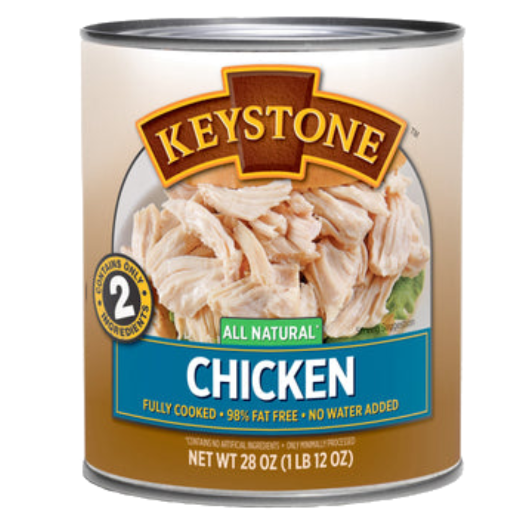 Keystone All Natural Chicken: Flavorful and tender chicken, ready to enhance your favorite recipes like chicken salad, fajitas, or as a pizza topping. Available in 14.5 oz and 28 oz cans.