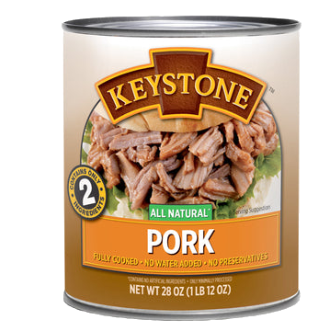 Keystone All Natural Pork: A versatile meat option, perfect for pulled pork sandwiches, casseroles, and more. Available in 14.5 oz and 28 oz cans.