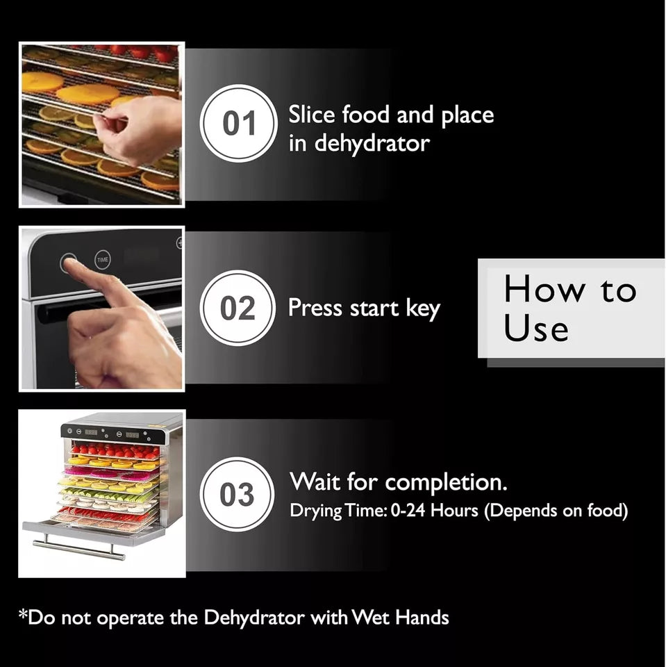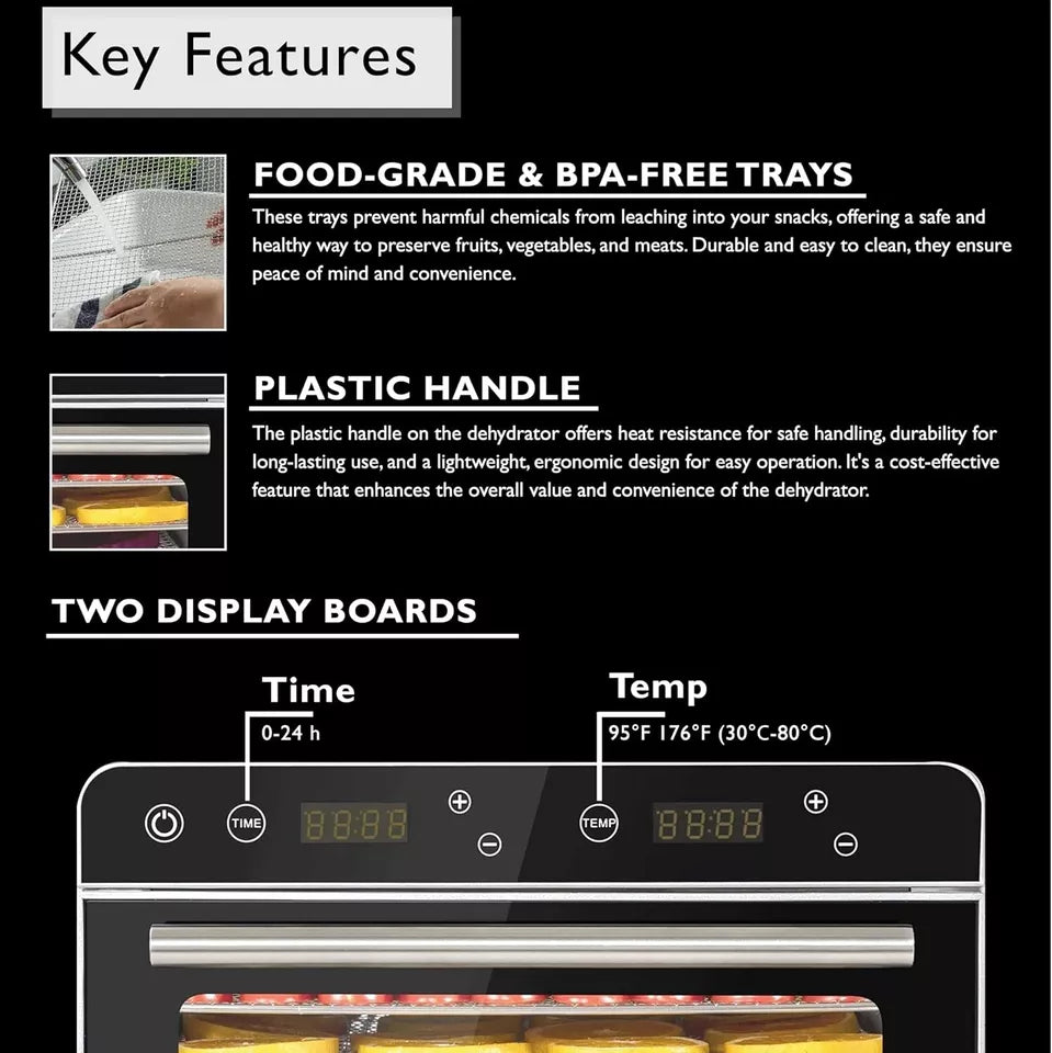 DURABLE MATERIAL:- Constructed with durable materials and featuring easy-to-clean trays, this food dehydrator is designed for long-lasting performance and hassle-free maintenance.