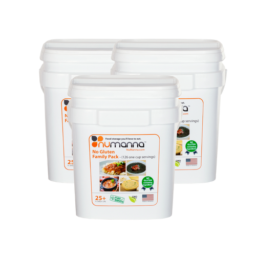 The Numanna Triple No-Gluten Family Pack offers the same high-quality, chemical-free recipes as our legendary family packs, but without any wheat gluten. Perfect for those with gluten sensitivities, this package includes three EZ Stack Buckets filled with a diverse selection of gluten-free meals. Enjoy nutritious and delicious food that meets your dietary needs now or in the future.