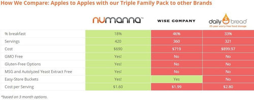 At NuManna, you don’t overpay for oatmeal and sugary drink mixes. Our Grab-n-Go meals are the perfect example. You get 70 servings of gourmet lunches and dinners and 10 servings of breakfast. This is the lowest ratio of breakfast in the industry. You get what you pay for. And with NuManna, you simply get the best you can buy.