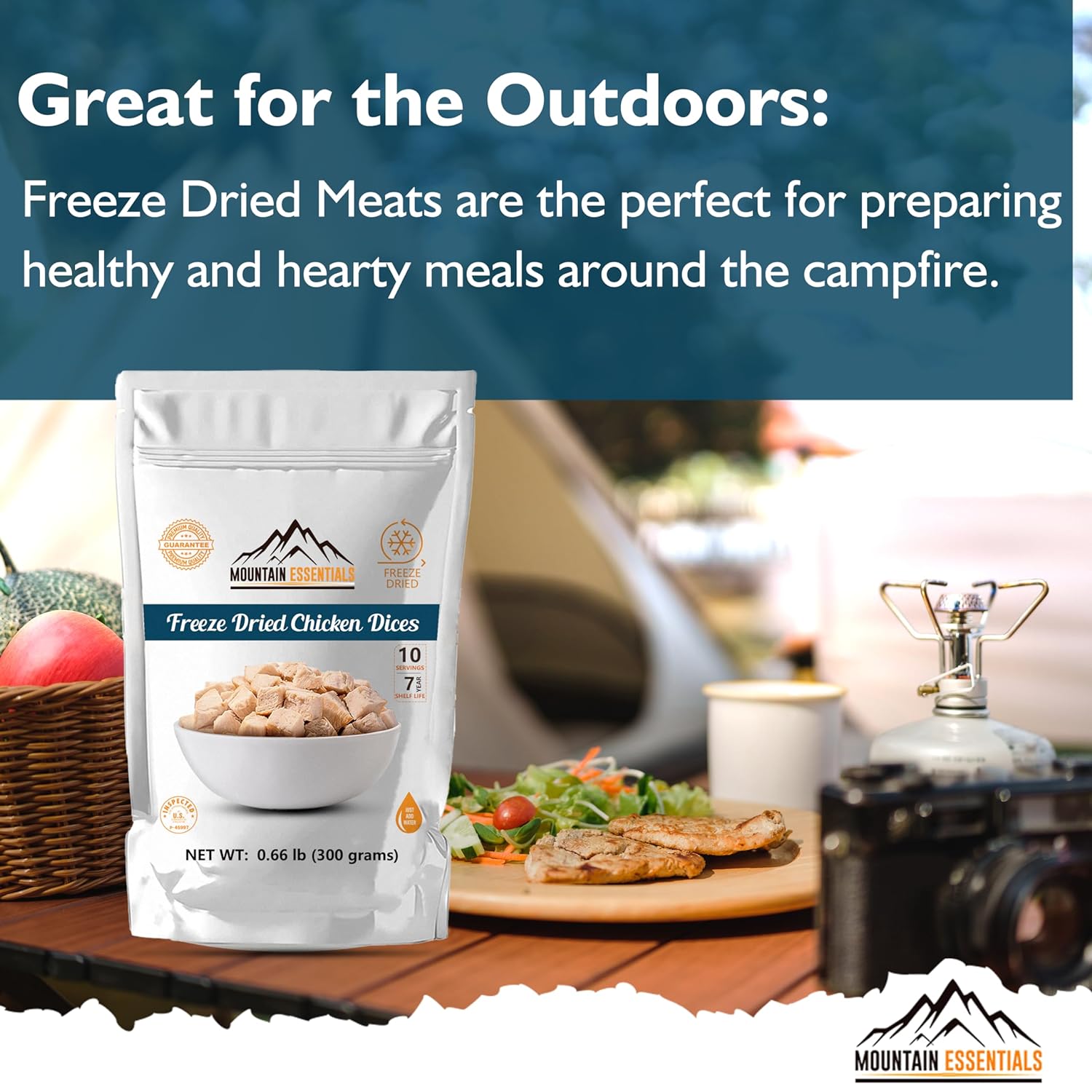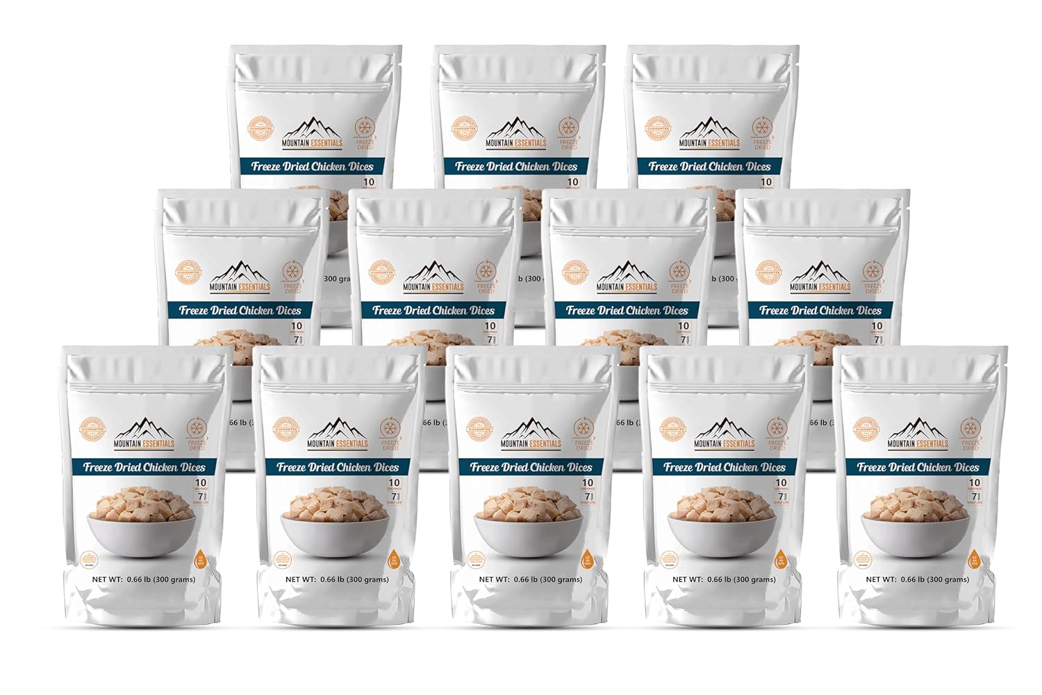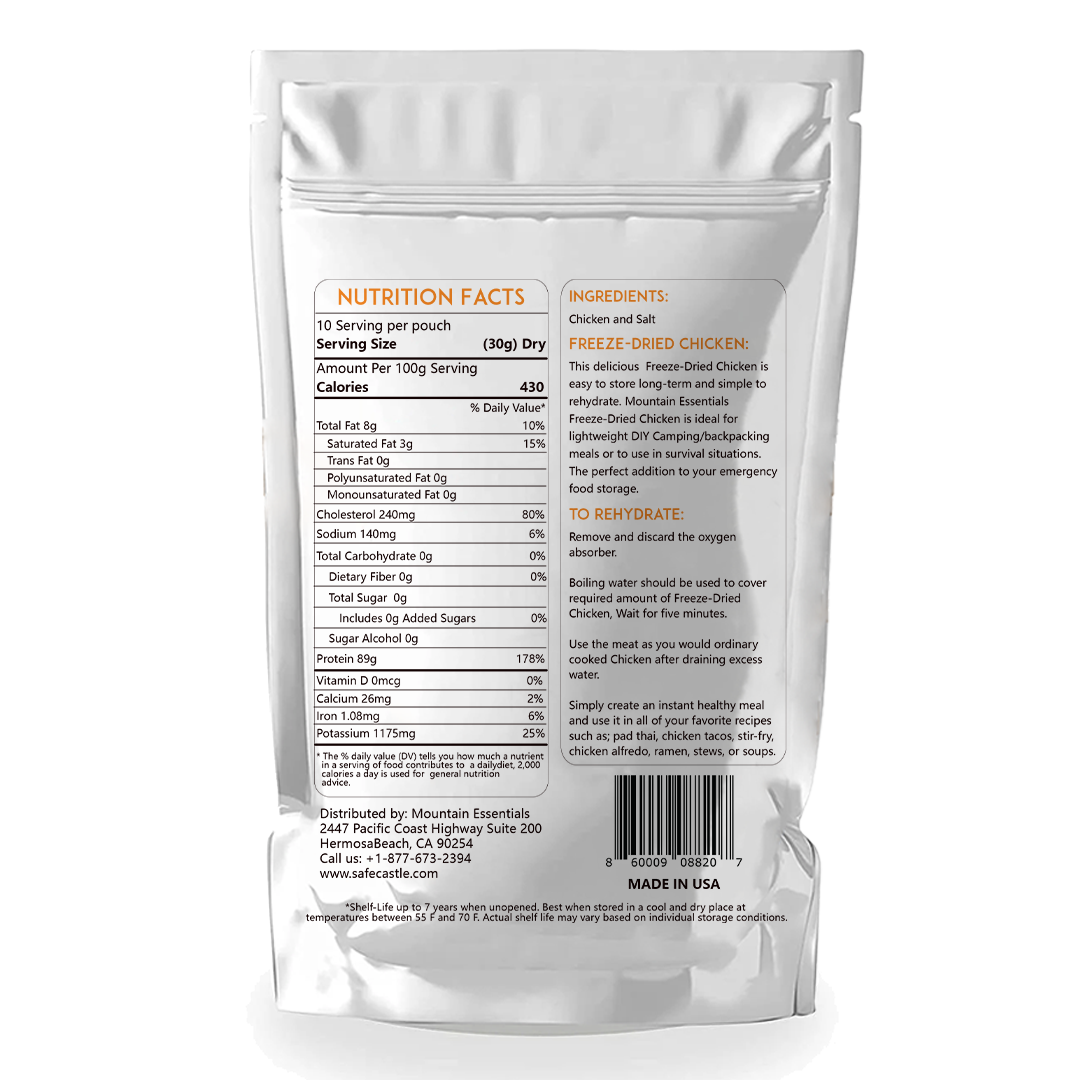 The Mountain Essentials Freeze-Dried Chicken Dices in a resealable pouch is a perfect addition to your food storage plan. This dehydrated chicken product is of premium quality and contains only two ingredients - chicken and salt. With a shelf life of up to 7 years when unopened, this product is ideal for emergency food supply needs.