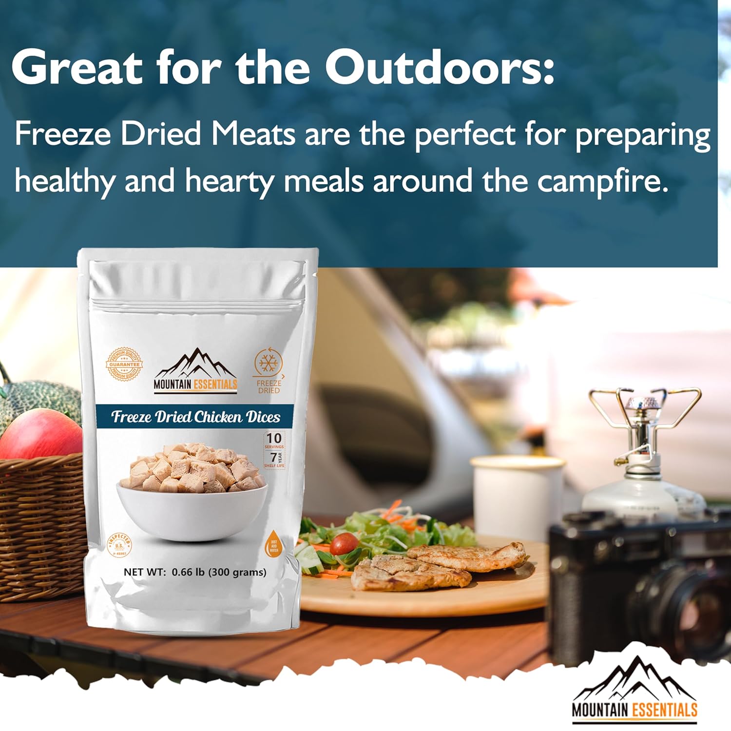 • FREEZE DRIED CHICKEN:- This delicious Freeze-Dried Chicken is easy to store long-term and simple to rehydrate. Mountain Essentials Freeze-Dried Chicken is ideal for lightweight DIY Camping/backpacking meals or to use in survival situations. The perfect addition to your emergency food storage.