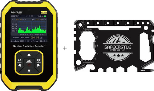 The pack contains the FNIRSI Radiation Dosimeter, which includes the geiger counter and its associated features, along with the Safecastle ToolKit Multitool kit, providing you with additional tools for your safety and convenience.