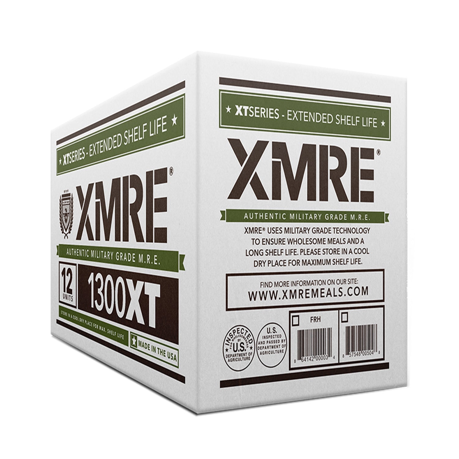 The XMRE 1300XT is a perfect emergency food supply that provides 1,200 - 1,500 calories of fully cooked MRE meals ready to eat. These military MREs also come with a flameless ration heater, making them ideal for Military and Law Enforcement, Medical and Emergency Preparedness, and Outdoor Excursions.