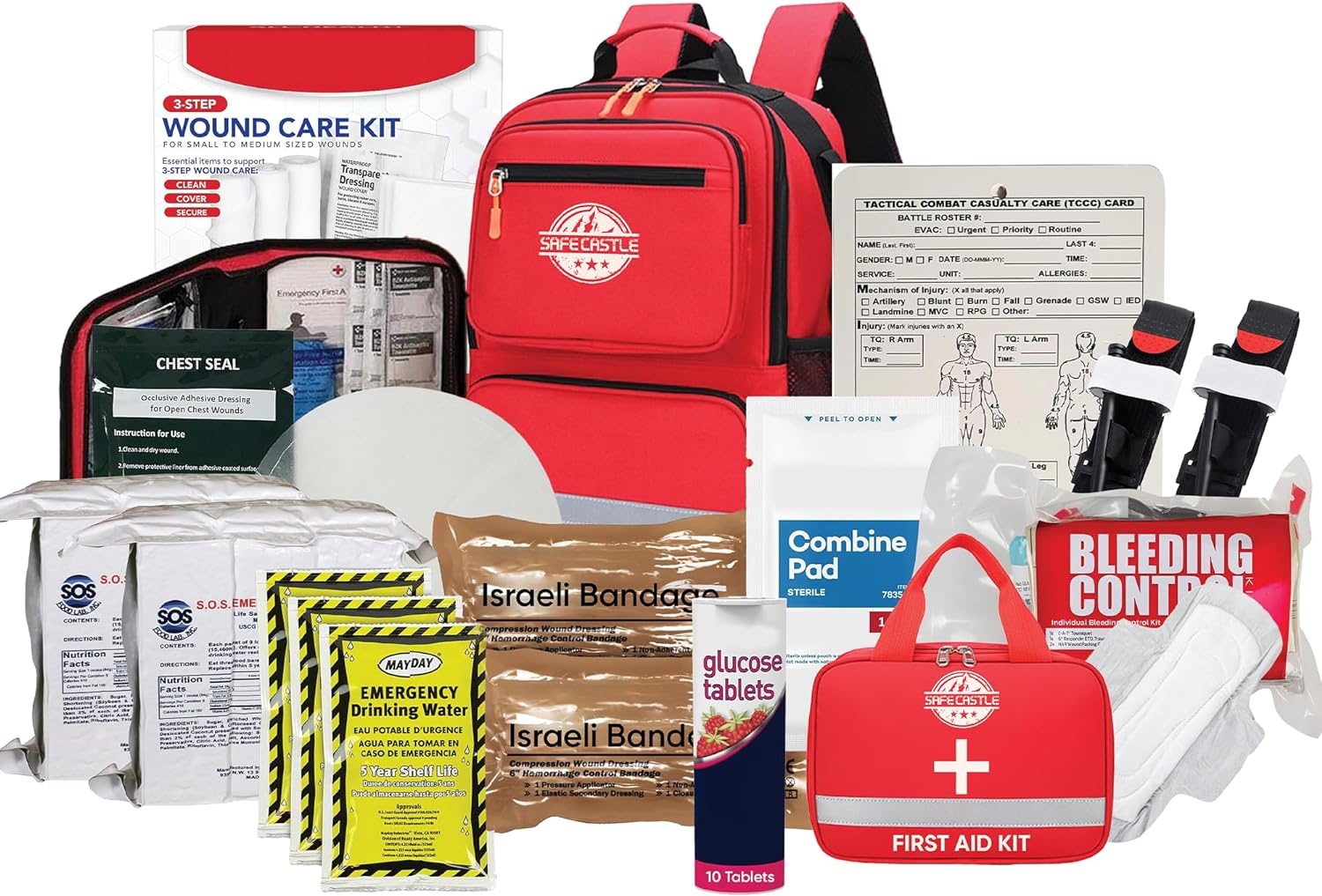 Our school compact toolkit features essential first aid supplies, emergency gear, and bleeding control items neatly organized in a red sling backpack. This kit is designed for quick response to injuries and emergencies, making it an excellent addition to your preparedness supplies.