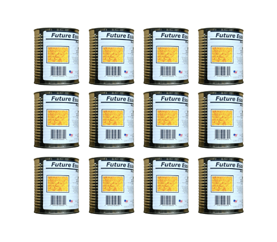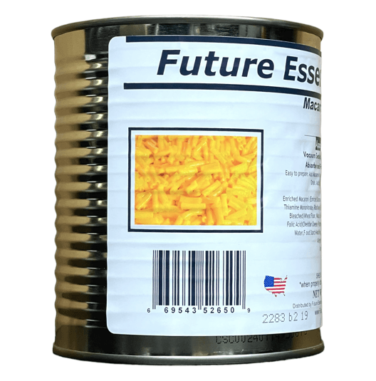 Future Essentials offers canned macaroni and cheese, which are ideal for emergency and long-term food storage. Available in #2.5 cans, each containing approximately 14-16 ounces, this ready-to-eat mac and Cheese provides six servings, equivalent to 2 boxes of traditional mac & Cheese.