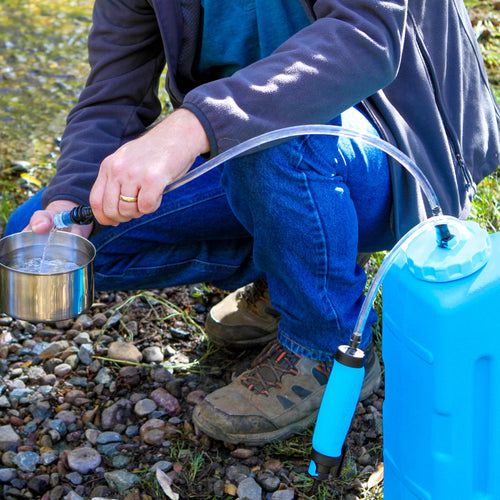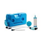 Kit includes: 1 AquaBrick™ Container, 1 DuraFlo™ Water Filter (treats up to 700 gallons), 1 hand pump, 1 spigot, tubing.