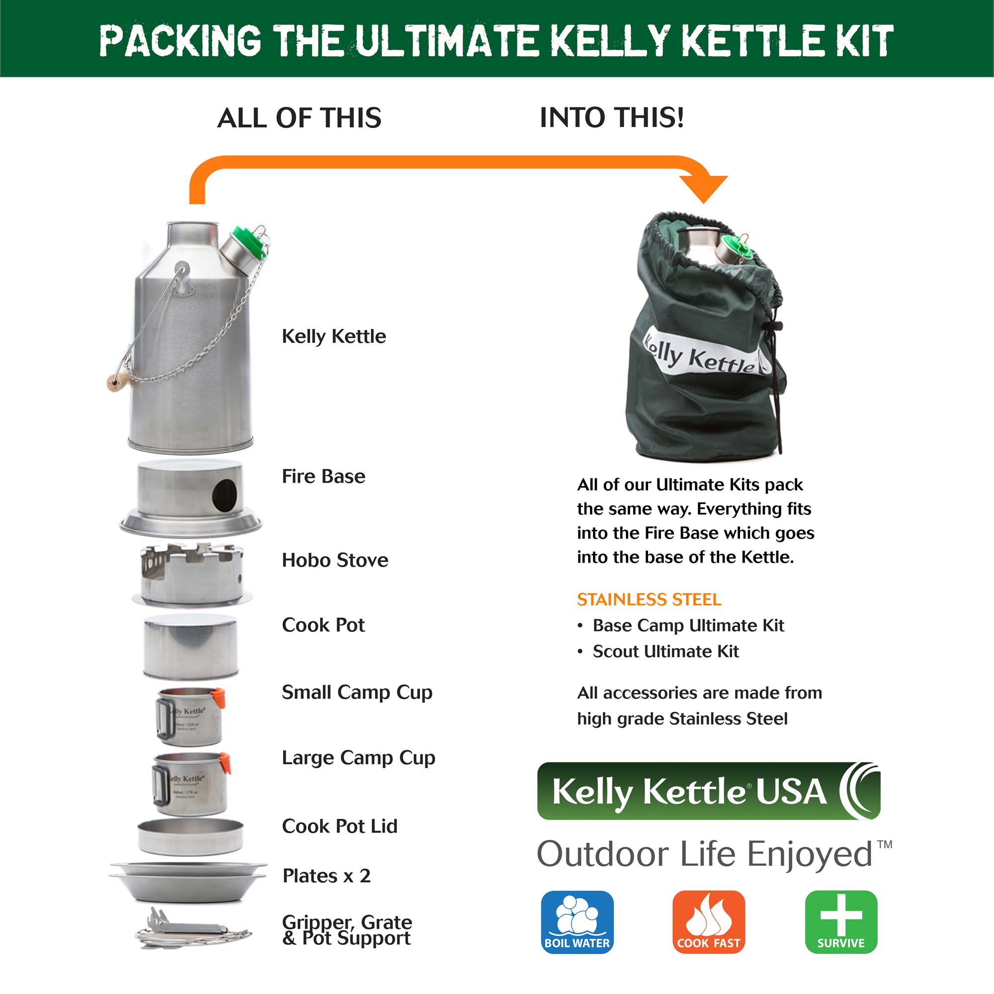 Kelly Kettle Camp Stove Ultimate Stainless Steel Scout Kit - Medium - Holds 41 oz of Water