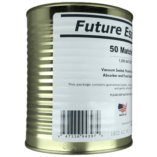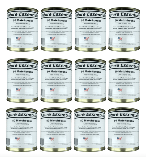 The Future Essentials Canned Matchbooks Disaster Kit contains #2.5 cans of waterproof matches. Each can contain 50 matchbooks, each with 20 matches, for  1000 matches. The canned matchbooks are stored in a waterproof container, so you can be sure they will be dry and ready to use, even in an emergency.