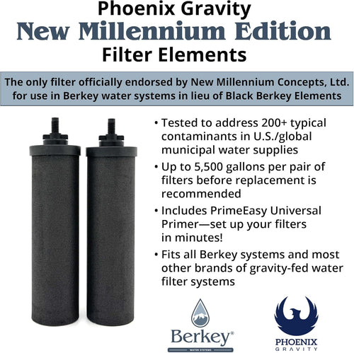 • THE ONLY OFFICIALLY ENDORSED REPLACEMENT FILTER - Buy with confidence—Phoenix Gravity New Millennium Edition Filter Elements are the only filter officially endorsed by New Millennium Concepts, Ltd. for use in Berkey water systems in lieu of Black Berkey Elements (BB9-2).