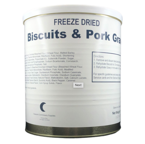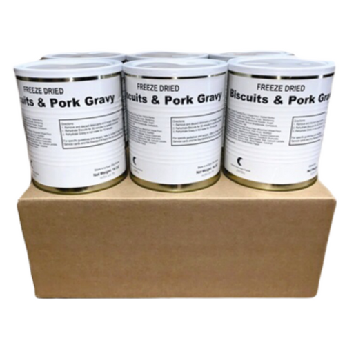 Military Surplus Freeze Dried Biscuits and Gravy is a traditional US food that is typically served for breakfast. These Canned Biscuits and Gravy are currently in production and will be manufactured in 2023 by a large military defence contractor. They have a 25+ year shelf life and do not require refrigeration.