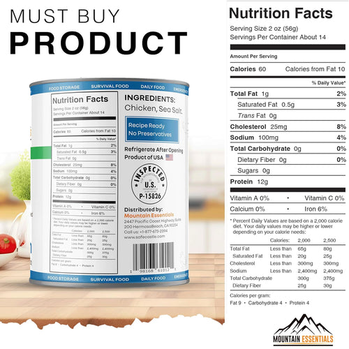 • Camping & Emergency Ready: Lightweight and portable, Mountain Essentials Canned Chicken is an excellent source of protein for your next camping trip or outdoor adventure. Plus, its long shelf life makes it a valuable addition to any emergency food storage plan.