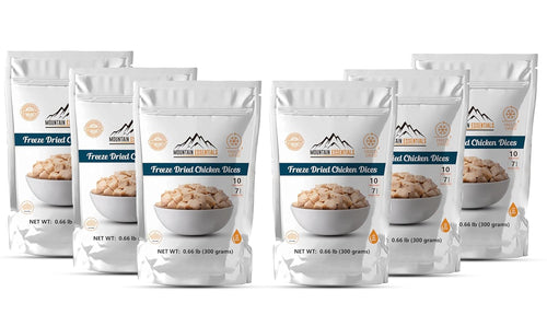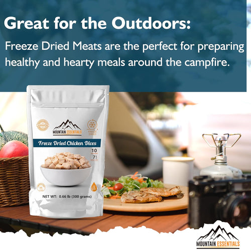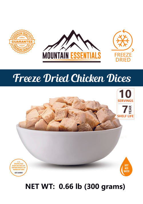 The Mountain Essentials Freeze-Dried Chicken Dices in a resealable pouch is a perfect addition to your food storage plan. This dehydrated chicken product is of premium quality and contains only two ingredients - chicken and salt. With a shelf life of up to 7 years when unopened, this product is ideal for emergency food supply needs.