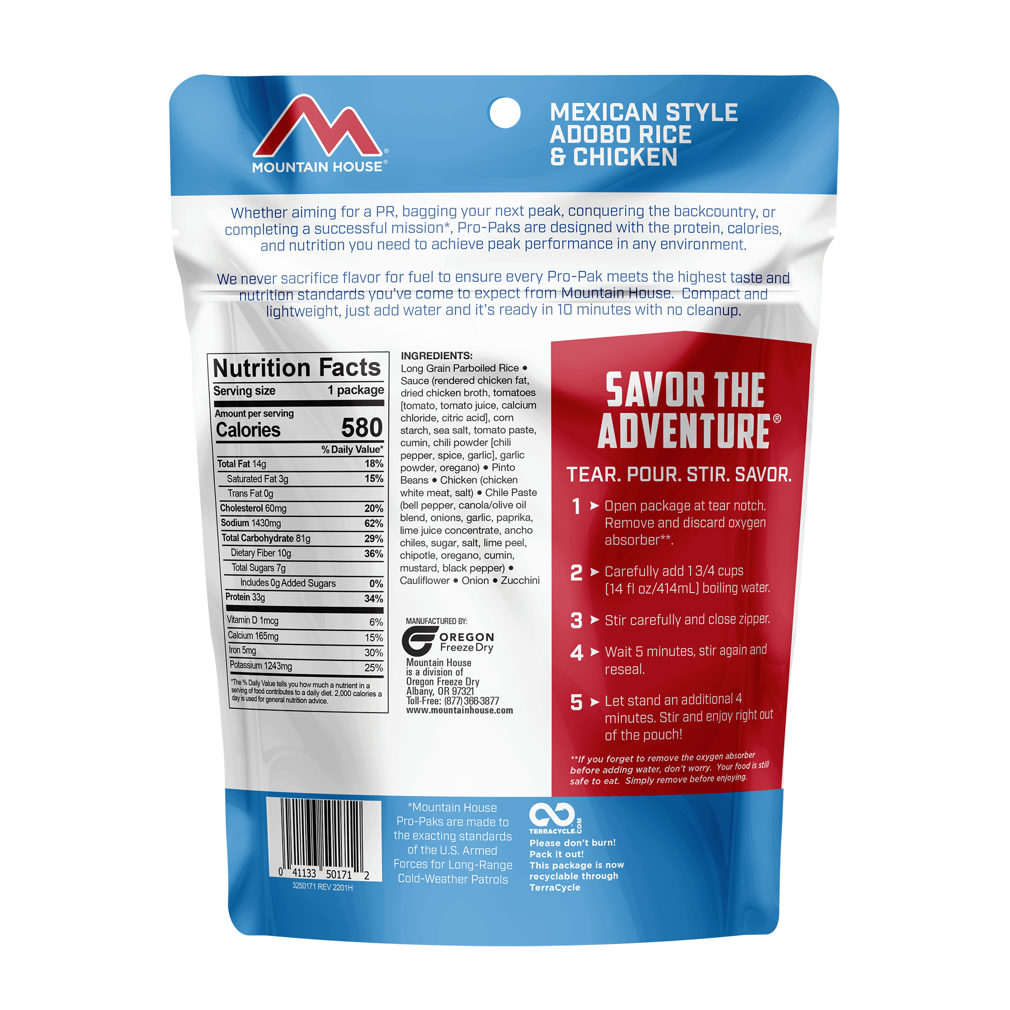 Essay on your next adventure with the hearty goodness of Mountain House Mexican Style Adobo Rice & Chicken Pro-Pak. This freeze-dried meal is packed with 33g of protein and 580 calories to keep you energized for miles to come.