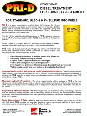 PRI-D is formulated to provide superior protection and enhancement for diesel fuels. It also treats up to 256 gallons of diesel fuel per bottle, ensuring optimal engine performance and longevity. PRI-D preserves stored fuels in refinery fresh condition, prevents fuel system issues like clogging and deposits, and enhances fuel combustion efficiency. It reduces smoke and soot emissions significantly, making it an essential choice for diesel engines, including those using low sulfur diesel (ULSD).